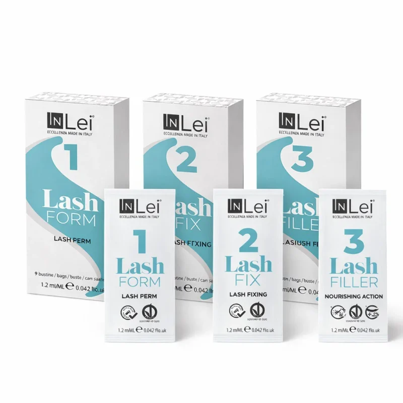 Профессиональный набор саше InLei для ламинирования ресниц включает три ключевых этапа для точной и контролируемой работы. В комплект входят Form1 для подготовки и раскрытия структуры ресниц, Fix2 для надежной фиксации и Filler3 для укрепления и утолщения.